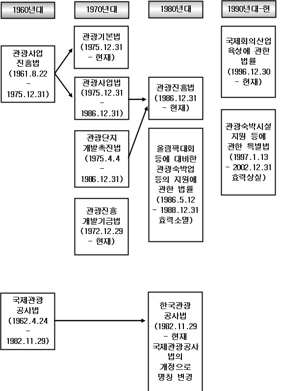 -이에 이어서 1962년 7월 9일 각령 제 874호로 관광사업진흥법 시행령을 1962년 11월 23일에는 교통부령 제 141호로 관광사업진흥법 시행규칙을 각각 마련하였음.