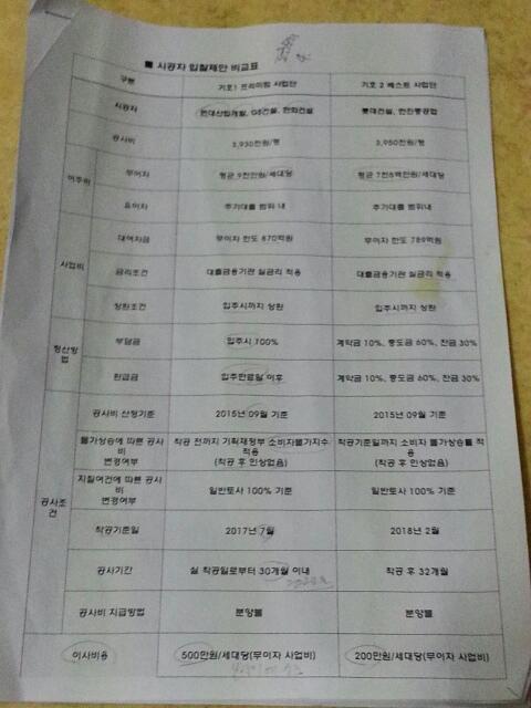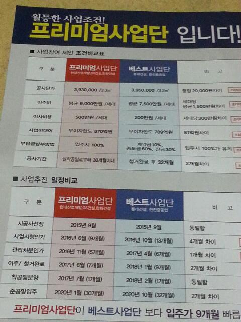 건설사선정 총회에 앞서 2015년 9월3일 대의원회의에서 사업단 비교대조표까지 요약해서 베스트사업단은 계약금10%, 중도금60%, 잔금30%로 요약하고 현, 건설사인 프리미엄사업단은 입주시 100%만 강조하여 설명하였다. 당연, 계약금, 중도금은 없고 입주시 잔금100%만 있는줄 알았다.