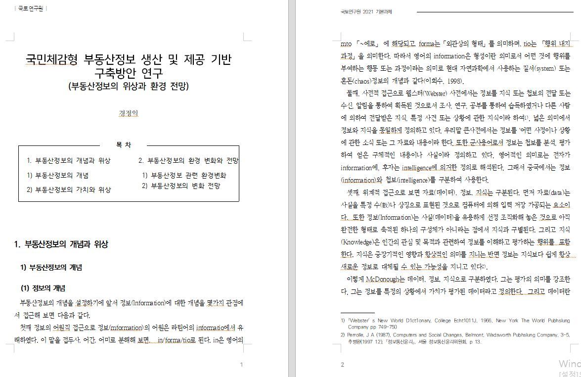 - 연구 담당 : 부동산정보의 개념, 가치, 위상과 함께 부동산정보 관련 환경변화와 전망에 대한 정리 및 시사점