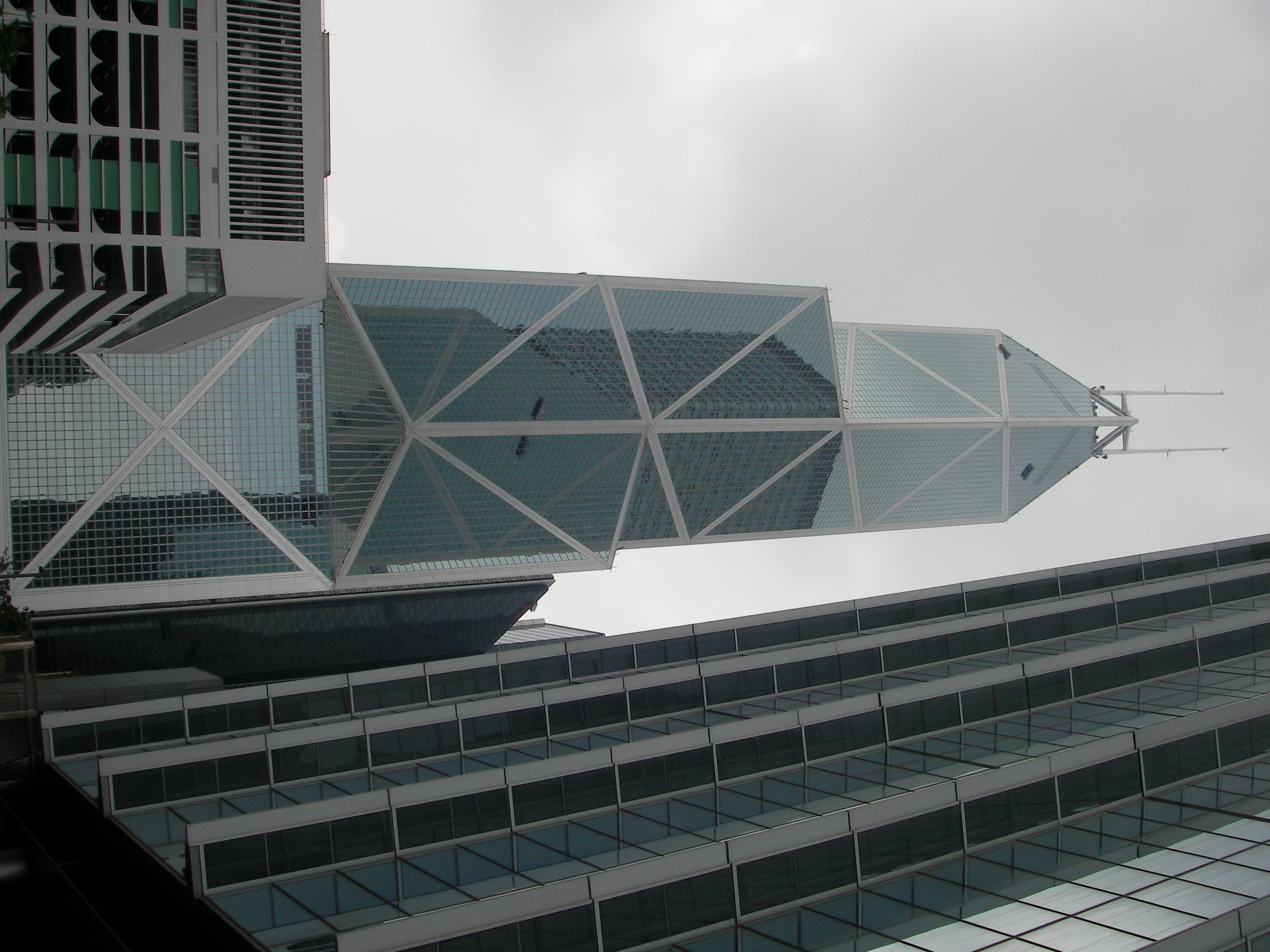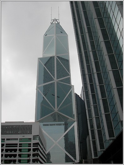 사진은 중국은행. 70층 369mm의 초고층으로 홍콩에서 3번째로 높은 빌딩이다. 삼각형 건물 4개가 모인 기하학적인 형태로 이것은 쑥쑥 자라는 대나무같은 거침없는 성장을 의미한다고 한다.