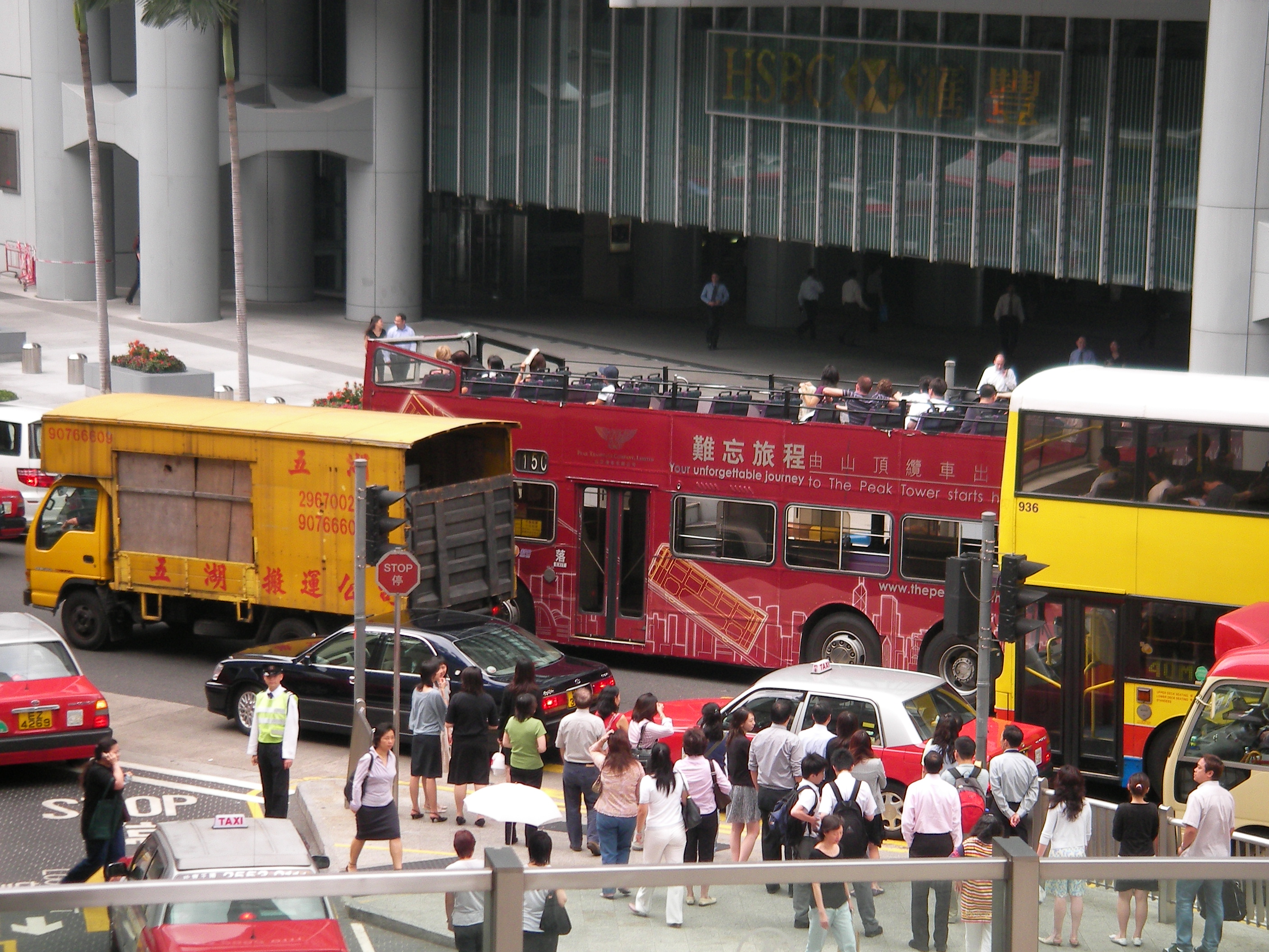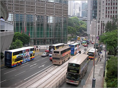 공중회랑을 거닐며 찍은 풍경이다. 2층 버스들의 겉을 화려하게 장식하고 있는 큼직한 광고가 인상적이다. 2층버스는 사람을 많이 태울 수 있는 장점도 있지만 주 목적은 눈을 즐겁게 해주는 '관광' 이 내포되어 있는 듯 하다. |