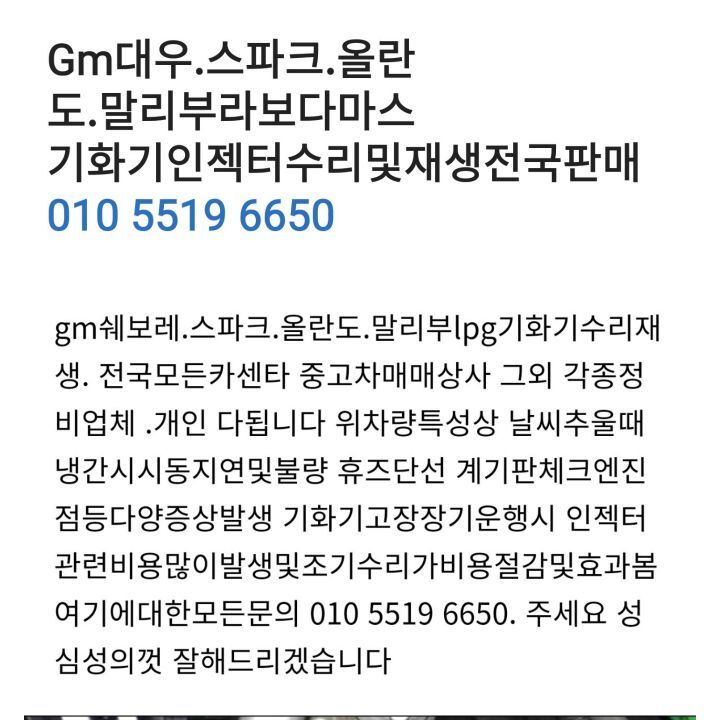 gm.쉐보레.스파크올란도말리부가스차량.lpg.기화기인젝터수리및재생품취급판매.010.5519.6650 작성자조용한하루|작성시간22.10.04|조회수207 목록 댓글 0 글자크기 작게가 글자크기 크게가 다음검색 현재 게시글 추가 기능 열기 북마크 공유하기 신고 센터로 신고 댓글 댓글 0 댓글쓰기 답글쓰기 댓글 리스트