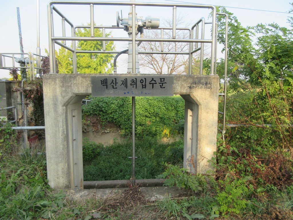 백산저수지는 1967년 호남야산개발이 시작되어 1972년 백산저수지가 만들어졌는데, 흐르는 물을 담수하는 담수호가 아닌, 양수저수지로 섬진강댐에서 방류된 물이 김제간선을 타고 흐르는 것을 검산동 양수장의 220마력 펌프를 이용해 퍼 올려 저수지에 모으는 형식이다.