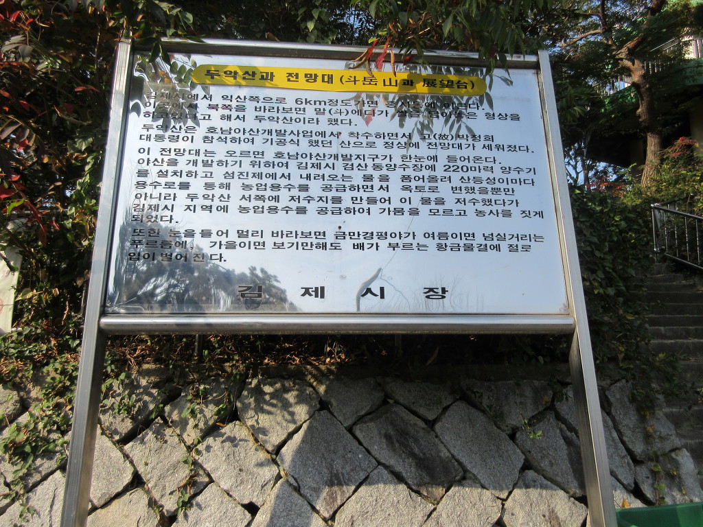 ☛두악산(52.6m) 정상에 설치된 관망대는 1960년대에 박정희 대통령이 호남야산개발을 하기 위해 참석하여 이곳에서 기공식을 갖은 곳으로 호남야산개발이 시작된 곳이다.