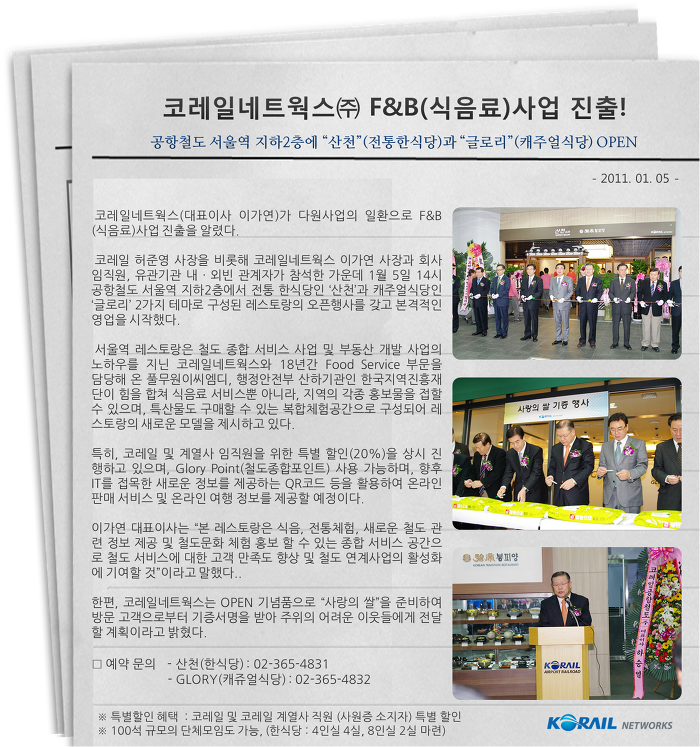 [KORAILnetworks]공항철도 서울역 지하2층 '산천' '글로리' 식당 개점[코레일네트웍스] 작성자철도고객센터|작성시간11.04.09|조회수379 목록 댓글 3 글자크기 작게가 글자크기 크게가 다음검색 현재 게시글 추가 기능 열기 북마크 공유하기 신고 센터로 신고 댓글 댓글 3 댓글쓰기 답글쓰기 댓글 리스트 작성자송배사랑 | 작성시간 11.04.09 음식이 맛갈스럽더군요.. 작성자쭈~! | 작성시간 11.04.15 특별할인 좋아요!!!^^ 서울역 2층 엔제리너스커피숍도 할인된대요~ (사원증제시) 작성자호아 | 작성시간 11.05.13 사원증이 없어요....ㅎㅎ ...빨리 발급 해주세요... 댓글 전체보기