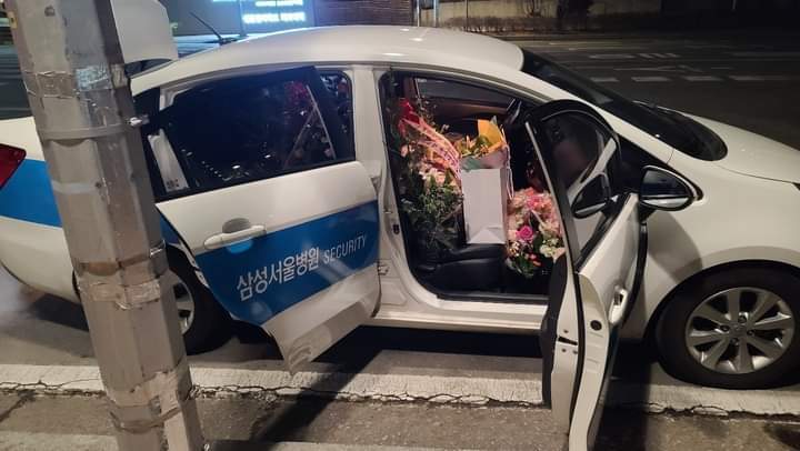 꽃다발 화환과 주신 선물을