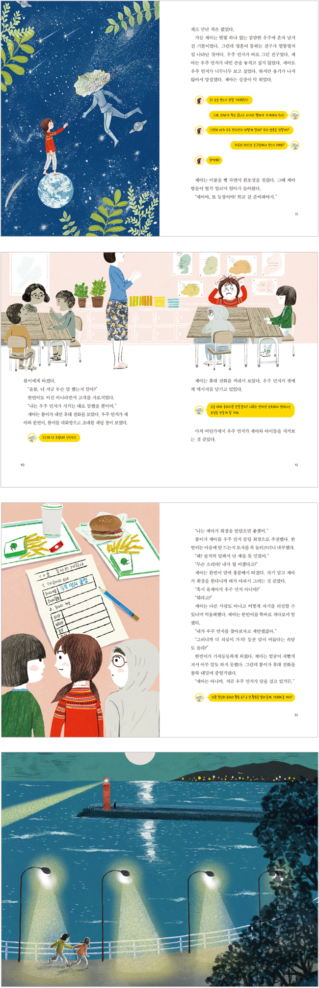마지막으로 작가의 말을 전합니다. 자유의 여신상의 원래 이름은 ‘세계를 비치는 자유’라고 합니다. 여러분도 힘든 고민이나 어려움으로부터 자유로워질 수 있으면 좋겠습니다. 우주 먼지와 제아가 둘만의 암호를 외쳤던 것처럼 여러분도 “자유의 여신상 콧구멍에서 만나!” 이렇게 외치면서 함께 웃을 수 있는 친구를 꼭 만나게 되기를 바랍니다.