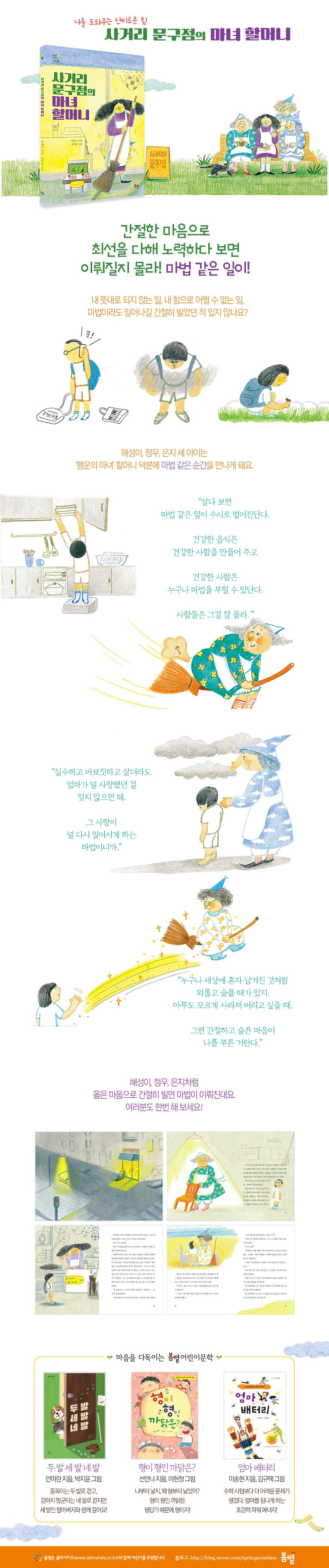 살아가면서 마법이 일어났으면 하는 순간은 꽤 많다. 점수가 엉망으로 나온 시험지를 들고 집에 가야 할 때, 지각을 하느냐 마느냐 하는 순간에 스쿨버스를 놓쳤을 때, 우상으로 생각하는 아이돌이나 스포츠 스타를 너무 보고 싶을 때 등등 수도 없이 꼽을 수 있을 것이다. 하지만 마법은 그리 쉽게 일어나지 않는다. ‘한 번쯤 일어났으면 하는 기적’처럼 좀체 일어나지 않는 일이다. 그런데 한정기 작가는 마법의 순간이 아주 없는 건 아니라고 말한다. “간절한 마음으로 최선을 다해 노력하다 보면” 마법이 이뤄질 수 있으며 “건강한 사람은 누구나 마법을 부릴 수 있다”고 한다. 진짜 가능한 일일까? 작가가 말하는 마법 이야기를 한번 들어보자. 초등 3~4학년 대상의 동화 《사거리 문구점의 마녀 할머니》는 해성, 정우, 은지 세 아이에게 일어나는 마법 같은 이야기이다.