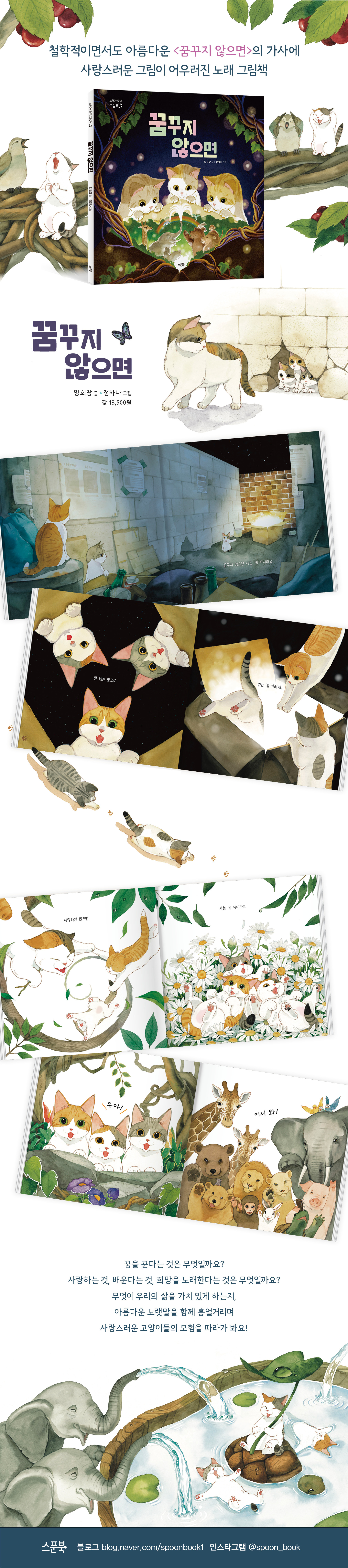 〈꿈꾸지 않으면〉의 아름다운 노랫말에 고양이 일러스트레이터 정하나 작가의 사랑스러운 그림이 더해져 탄생한 스푼북 〈노래가 좋아 그림책〉 시리즈의 첫 번째 책! 책 속에서 세상을 배우고, 희망을 그리며, 서로를 사랑한다는 것, 아름다운 꿈을 꾼다는 것의 참 의미와 가치를 함께 생각해 봐요.