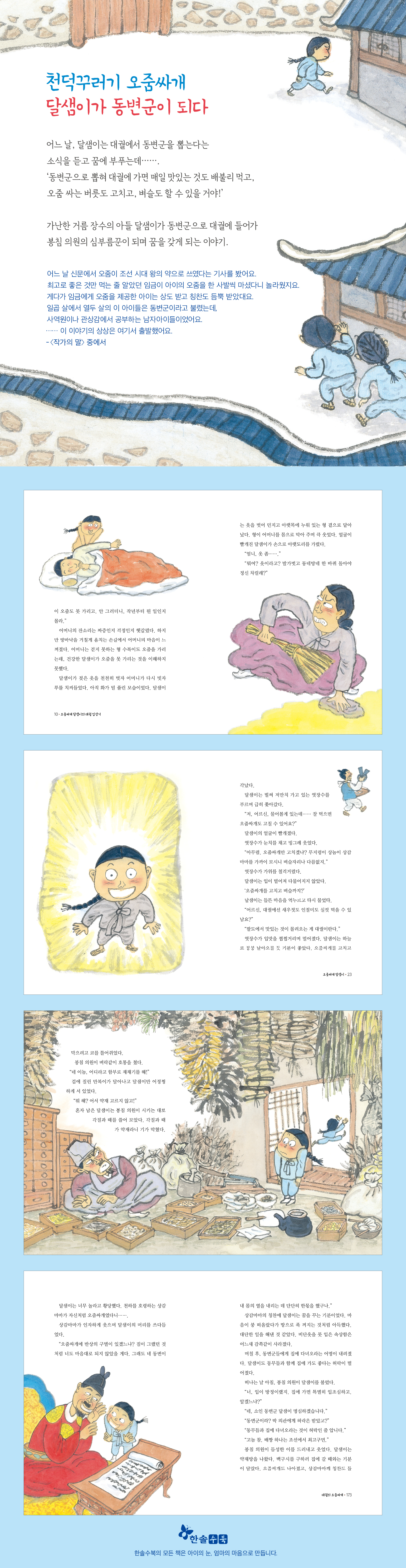 《오줌싸개 달샘이의 대궐 입성기》는 가난한 거름 장수의 아들, 오줌싸개 달샘이가 동변군으로 대궐에 들어가고 봉침 의원의 심부름꾼이 되며 성장하는 이야기를 담고 있습니다. 오줌싸개로 놀림을 받던 달샘이가 대궐에서 다양한 경험을 하며 자신의 꿈을 찾는 과정을 재미있게 풀어냈지요.