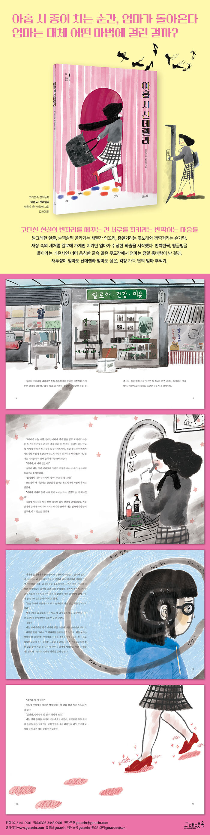 사라진 엄마를 찾아 여기저기 헤매 다니는 명아. 그런데 엄마가 주인인 가게에도, 평소 엄마가 잘 다니던 골목골목에도, 터덜터덜 발을 끌며 돌아간 집에도, 그 어디에서도 엄마를 찾을 수가 없습니다. 가게에 손님이 없어도 머리를 콩콩 찧어 가며 자신의 자리를 지켰던 엄마인데, 엄마는 대체 어디로 사라진 걸까요? 그런데 밤 아홉 시 종이 땡, 하고 울리자 엄마는 보란 듯이 집으로 들어옵니다. 발갛게 상기된 얼굴, 슬며시 올라가 있는 입꼬리, 움찔움찔 현란한 손놀림이 뭔가 수상합니다. 그때, 따르릉! 전화가 걸려 옵니다. 아빠. 우리 가족을 위해 먼 데 가서 일하고 있는 아빠의 전화입니다. 약속이라도 한 것처럼 아빠에게서 전화가 걸려 오는 매일 밤 아홉 시는, 온 가족이 함께 얘기할 수 있는 유일한 시간입니다. 그런데 방금 집에 돌아온 엄마는, 전화선 너머 아빠에게도 오늘 가게 일이 잘되었다며 거짓말을 합니다. 명아는 그런 엄마의 모습이 너무 낯설고 불안합니다. 혹시··· 바깥에서 아무도 모를 왕자님을 만나 엄마가 바람이 난 건 아닐까? 늘 같은 자리에서 내 곁을 지켜 줄 것만 같았던 엄마의 부재. 엄마를 찾아 헤매다 눈물 찔끔 나는 엄마의 사랑을 알게 되는, 명아의 이야기가 펼쳐집니다.