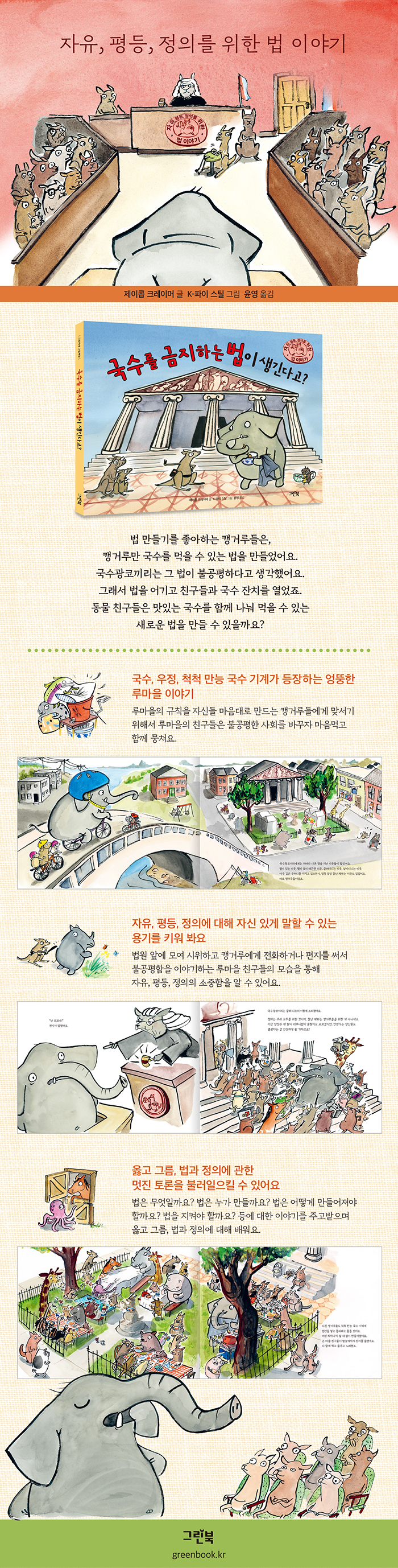캥거루만 빼고 바닷가에서 헤엄칠 수도 없고, 나비 정원에 놀러 갈 수도 없고, 법도 만들지 못하는 루마을이 있어요. 이러한 불공평한 사회를 변화시키기 위해 국수광코끼리는 자신의 목소리를 높이고자 다른 친구들과 함께 뭉치죠. 루마을의 규칙을 자신들 마음대로 만드는 캥거루들에게 맞서기 위해서요. 친구들은 법원 앞에 모여 시위를 하기도 하고 캥거루에게 전화를 하거나 편지를 써서 법의 불공평함을 계속 이야기해요. 루마을의 이야기를 읽으며 아이들은 우리 사회의 불공평함을 변화시킬 수 있는 용기 있는 모습, 루마을 친구들이 서로를 아끼고 힘을 뭉치는 협력, 그리고 스스로 자기 결정을 할 수 있는 자유의 소중함을 알 수 있어요. 더 나아가 불공평한 사회에 자신과 모두를 위해 목소리를 높이는 용기를 키울 수 있어요.
