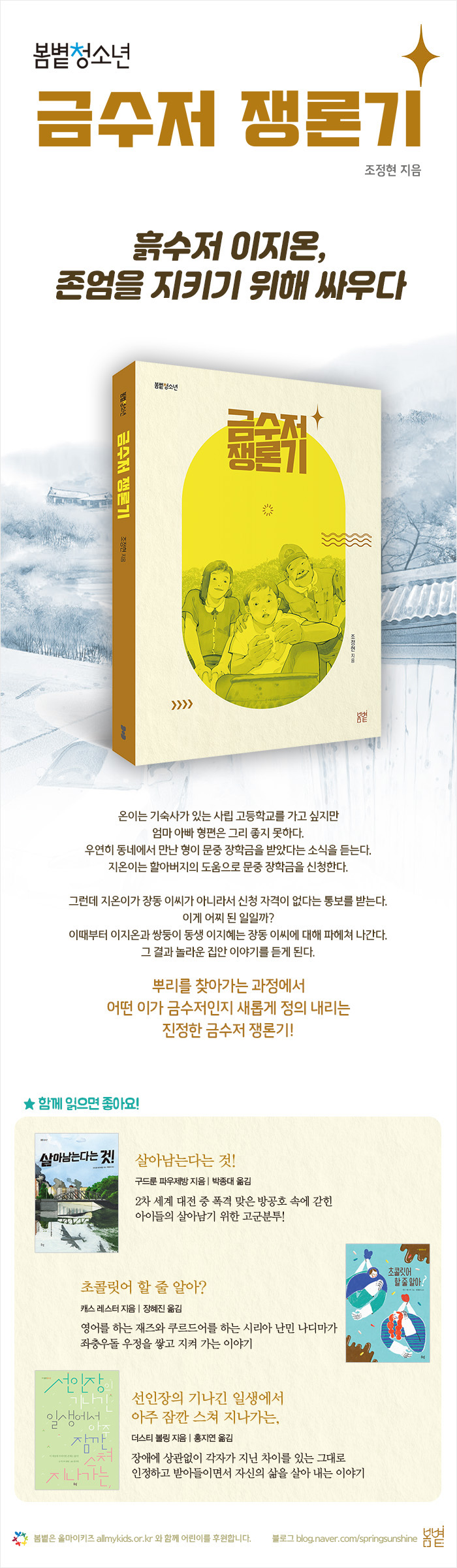 《금수저 쟁론기》는 한국 사회를 뒤덮은 ‘금수저-흙수저 논쟁’을 비판적으로 조명하는 청소년소설이다. 자동차 공장 해고 노동자의 아들 ‘이지온’이 단체 대화방에서 조리돌림을 당한 뒤 의사가 되겠다고 결심하는 데서 이야기가 시작된다.