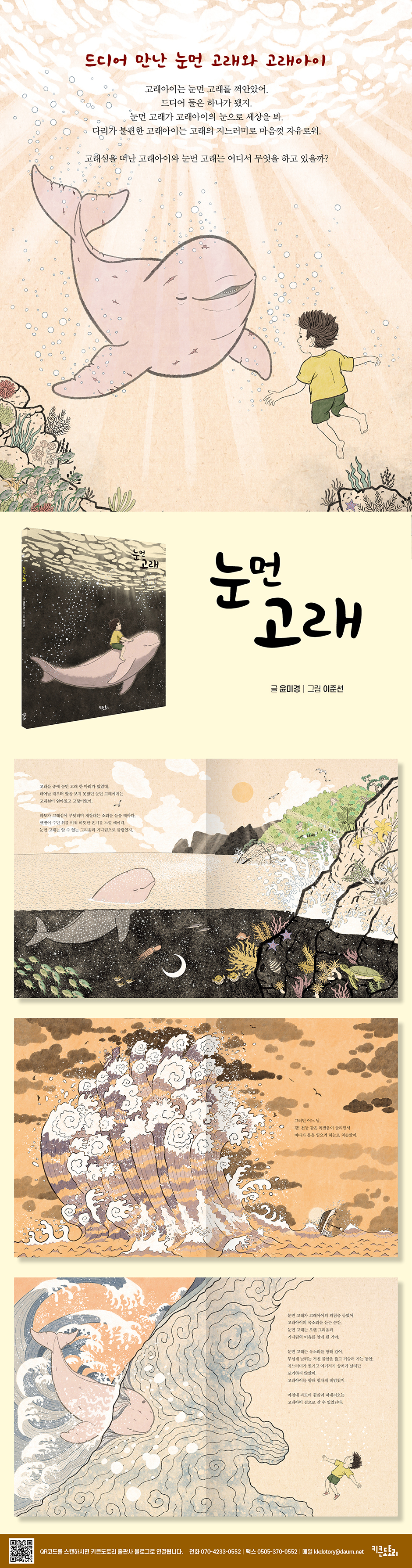 작가는 눈먼 고래와 다리가 불편한 고래아이의 만남을 다룬, 환상적이고 전설 같은 이야기를 통해 자연과 더불어 사는 것의 의미와 자연환경 파괴로 생기는 환경 문제를 짚어보고자 했습니다. 책을 읽으며 눈먼 고래와 고래아이가 서로의 부족한 점을 채우며 어려움을 헤쳐 나가는 모습을 보고 있으면, 자연과 사람이 더불어 살아가는 삶이 어떤 것인지 다시 한번 생각하게 됩니다.