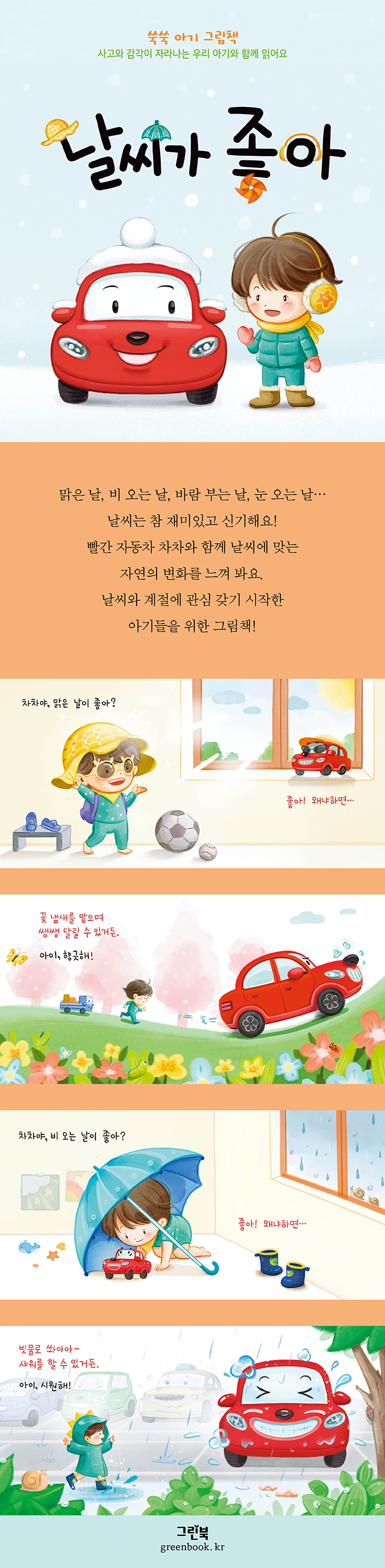 날씨는 매일 변하기도 하고, 계절에 따라 달라지기도 하며 이에 따라 변하는 자연 현상은 유아들이 호기심을 갖고 관찰할 수 있는 유용한 경험이 됩니다. 어린이집에 가는 길, 가족과 함께 나선 외출과 나들이, 창밖의 바깥 풍경을 통해 일상적으로 접하는 다양한 날씨를 아기들은 어떻게 느끼고 있을까요? 《날씨가 좋아》는 아기와 장난감 자동차가 알콩달콩 주고받는 대화를 통해 맑은 날, 비 오는 날, 바람 부는 날, 눈 오는 날의 모습을 정답게 보여 주는 책입니다. 봄, 여름, 가을, 겨울을 직접 드러내진 않았지만 자연스레 사계절을 연상할 수 있도록 계절에 따른 배경 묘사를 더했습니다.