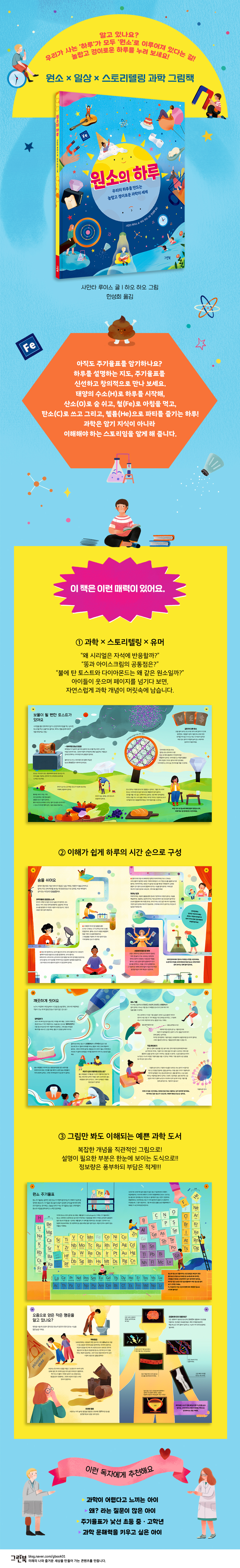 아침에 눈을 떠서 호흡을 하고, 시리얼으로 빈 속을 채우고 화장실에 가서 볼일을 하는 일상적 습관들 속에서 우리를 움직이는 원소들을 하나씩 살펴본다. 인체가 6개의 원소로 이루어져 있다는 놀라온 사실뿐 아니라, 우리의 음식, 안경, 옷, 연필 등에 담긴 원소들을 통해 물질의 원리도 배운다. 수소, 산소, 탄소, 헬륨, 철, 인 등 원소들이 주기율표 안에 죽어 있는 화학 요소가 아니라, 우리 삶을 움직이고 나와 지구를 움직이는 작고도 큰 요소들이라는 것을 쉽게 이해할 수 있다. 이 책은 과학이 우리가 암기하고 배워야 할 학습 내용이 아닌, 살아가는 데 필요한 원리 요소임을 실감하게 해 주는 책이다. 아침부터 밤까지 이루어지는 하루의 스토리텔링은 아이들에게 과학의 문해력을 키워 주는 기회가 될 것이다.