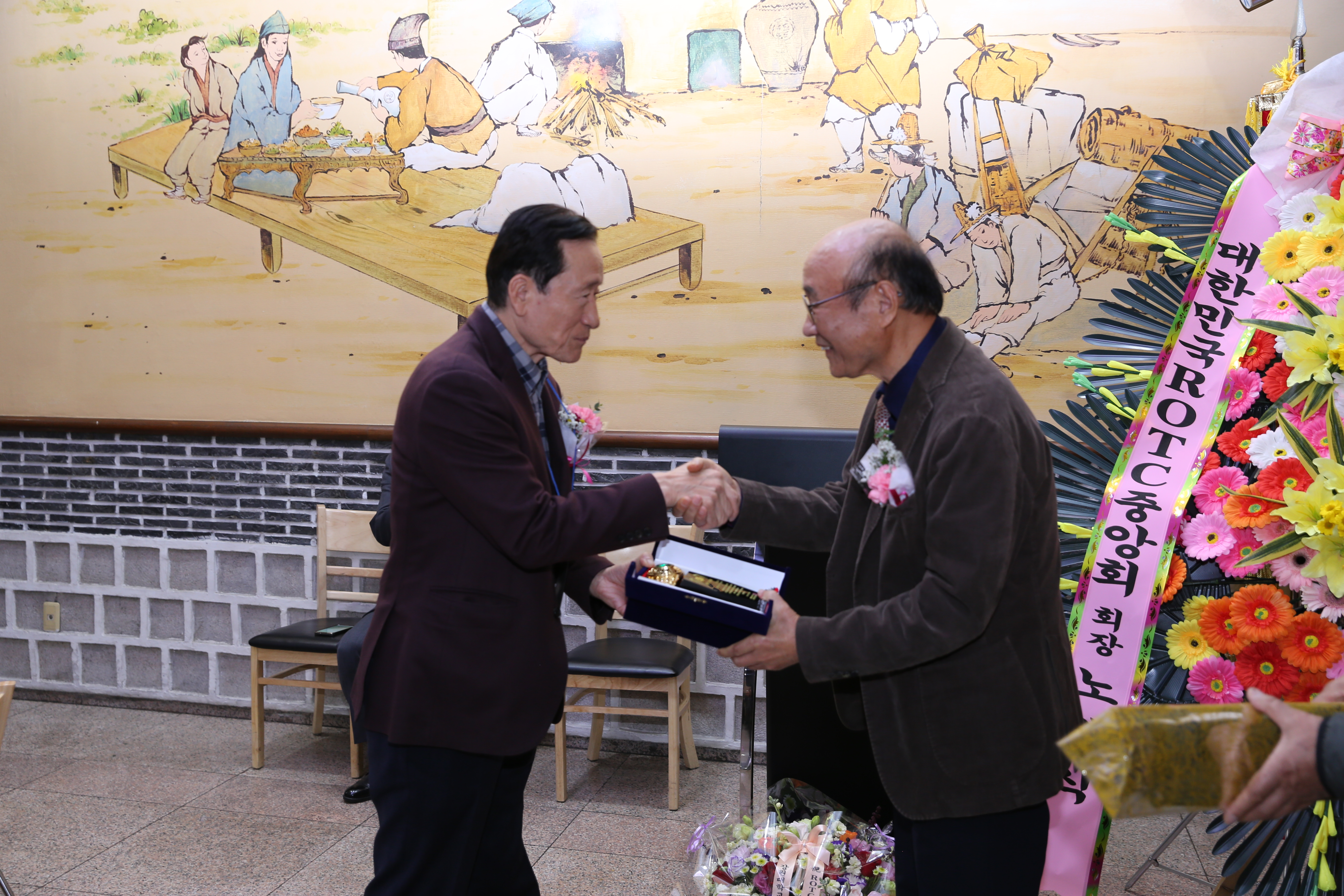신임 한승일 회장에게 강원대학교 ROTC 총동문회장 김종명회장이