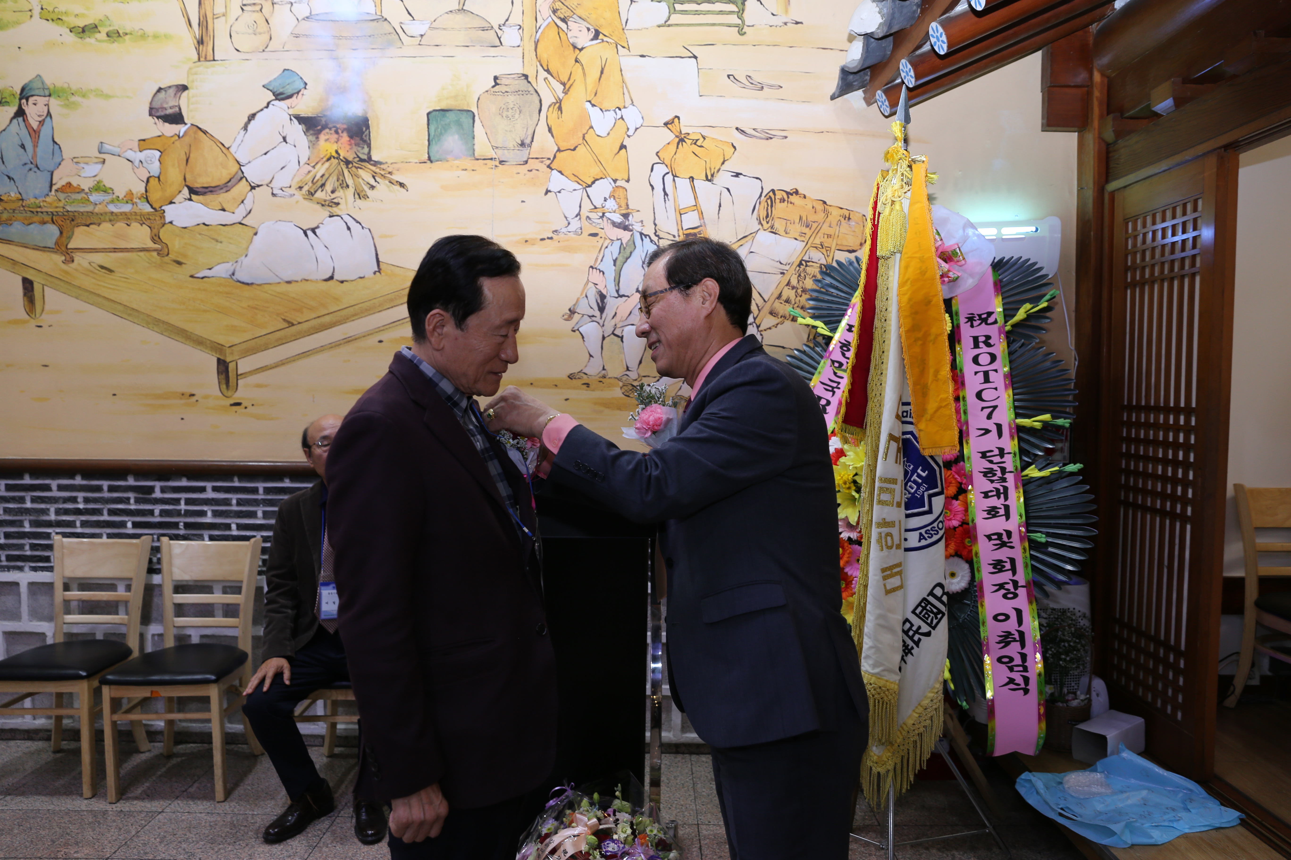 중앙회로 부터 신임 회장에게 증잉회 임원뱃지를 달아주고 있다