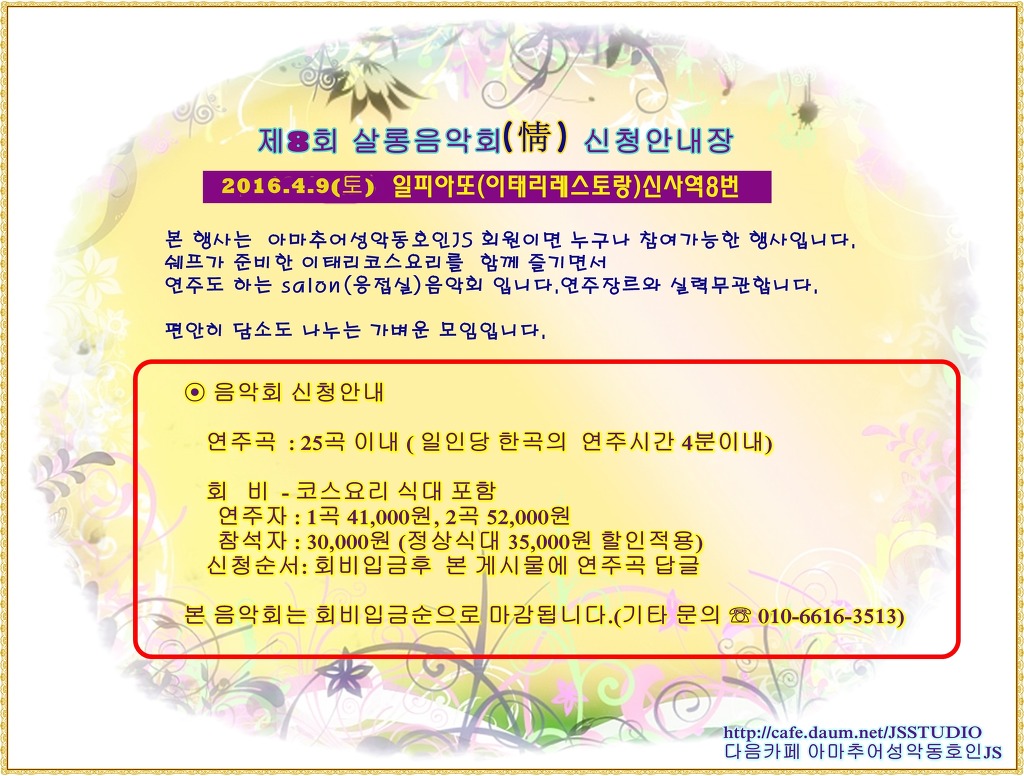 [스크랩] 제8회 살롱음악회(情)-2016.4.9(토) 신청안내 작성자漁鮮 이재성|작성시간16.03.07|조회수35 목록 댓글 0 글자크기 작게가 글자크기 크게가 다음검색 스크랩 원문 : 아마추어성악동호인JS 현재 게시글 추가 기능 열기 북마크 공유하기 신고 센터로 신고 댓글 댓글 0 댓글쓰기 답글쓰기 댓글 리스트
