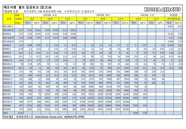 각 사이즈의 볼트의 잠금 토르크 비교표 입니다.