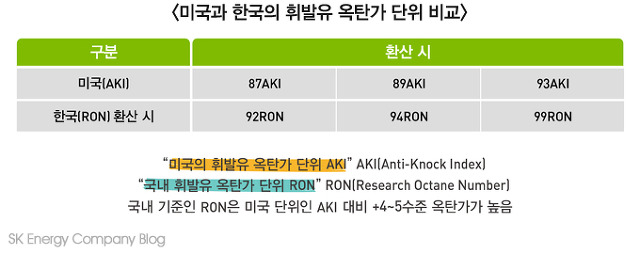 우리가 알고 있는 옥탄가의 기준은 표기의 단위가 미국 과 다릅니다.