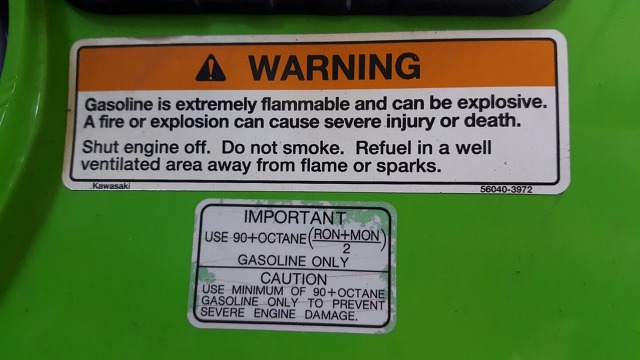 가와사키의 PWC( 제트스키 & 수상오토바이) 300X 경우입니다. 90옥탄 이상 연료를 사용하라고 경고 하고 있습니다.