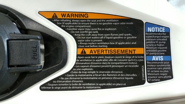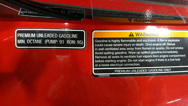 아래 사진은 야마하 슈퍼챠져가 장착된 PWC( 제트스키 & 수상오토바이) 연료주입구에 붙여져 있는 스티커 입니다.