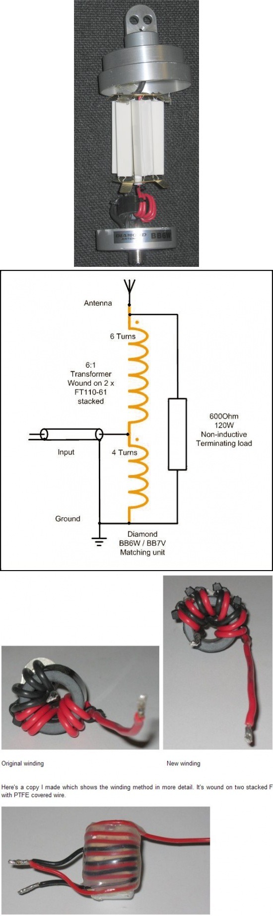 | 다이아몬드 BB6W 안테나 내부구조 제원: -주파수:2∼30MHz HF대 -형식:롱 와이어 형 -임피던스:50Ω -VSWR:2.0 이하 -내 입력:250W -접전:M-J형 -전체 길이:6.4m -중량:0.8kg(와이어포함) *안테나 튜너 사용 필수 출처: http://g8jnj.webs.com/cometcha250b.htm 설명서: ftp://ftp.qrz.ru/pub/hamradio/antenna/diamond/BB6W.pdf |