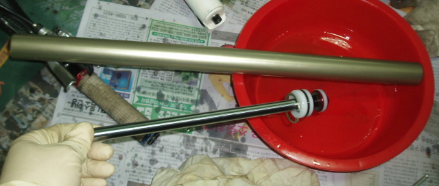 주시면서 리바운드 어셈블리 로드를 잡아당겨 업퍼 튜브에서 완전히 분리해주세요. 사진은 분리된 리바운드 어셈블리