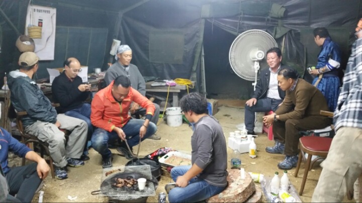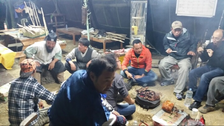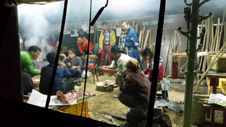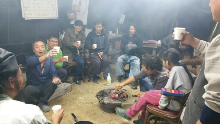 멧돼지 고기와 광주팀들이 가져온 무등산 막걸리.