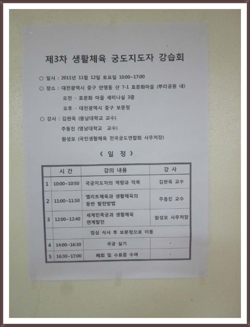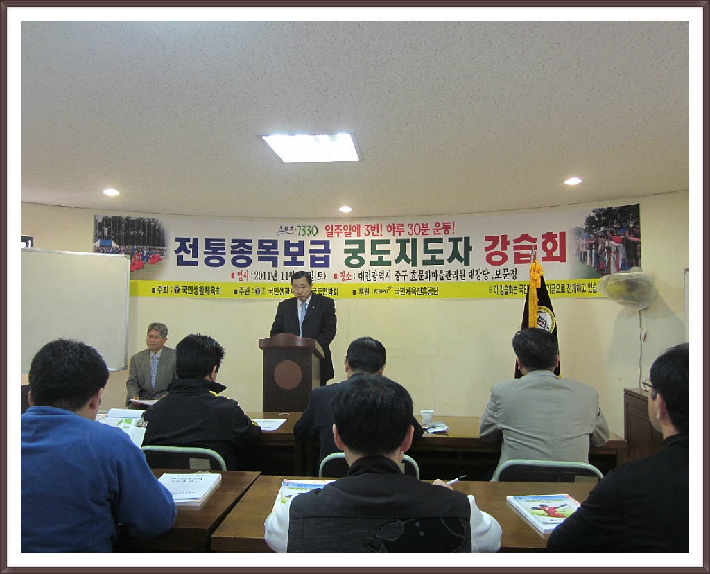 작성자악돌이(장영민) 작성자 본인 여부 작성자 작성시간 11.11.13 참으로 유익한 강습회였던것 같읍니다.지도자의 덕목과 엘리트체육과 생활체육의 발전방향 등 다양한 부분들이 논의된 소중한 시간이되었답니다.. 부족하고 미흡한 부분도 있었지만 궁도인들 스스로 공부하고 배우며 국궁문화를 이해하고 실천해 나가는 계기가 되길 바래 봅니다..준비하신 모든 분들께 감사의 마음 전합니다...