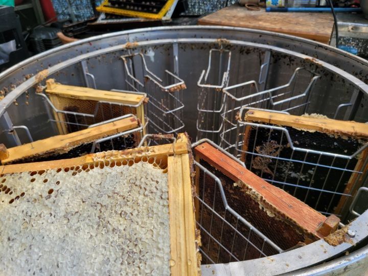꿀장을 넣고 채밀기를 돌리면 꿀이 나온답니다...