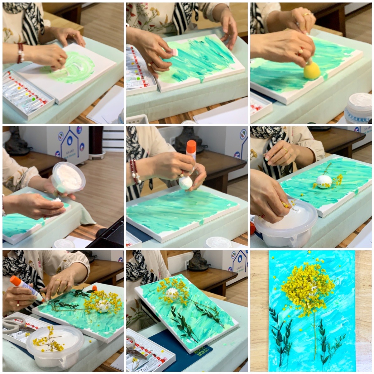 미술치료사로 다년간 활동 해 오신 박정아선생님의 미술심리적 접근과 원예심리적 접근의 수준 높은 콜라보로 진행되었는데요 만다라트를 이용한 (나의 희망을 이뤄가는 목표 설정 찾기 제안 ex. 일본 야구선수 오타니쇼헤이의 고교때 작성한 만다라트 ) 미술심리적 접근에 더하여 민들레의 씨앗 번식과 성장의 특징을 통한 원예심리적 접근으로(나의 긍정적 성장 인식 높이기 ex. 도서감상-너는 어떤 씨앗이니? ) 역량강화 프로그램이 진행되었습니다. 프리저브드 안개꽃과 미스티블루, 유칼립투스 등 잎소재 그리고 천사클레이, 젯소, 아크릴물감 등을 사용하여 대상자(초, 중등생)들의 오감을 자극할 수 있는 전개로 민들레 꽃의 홀씨 날림을 표현 하는 결과물을 완성하였습니다.
