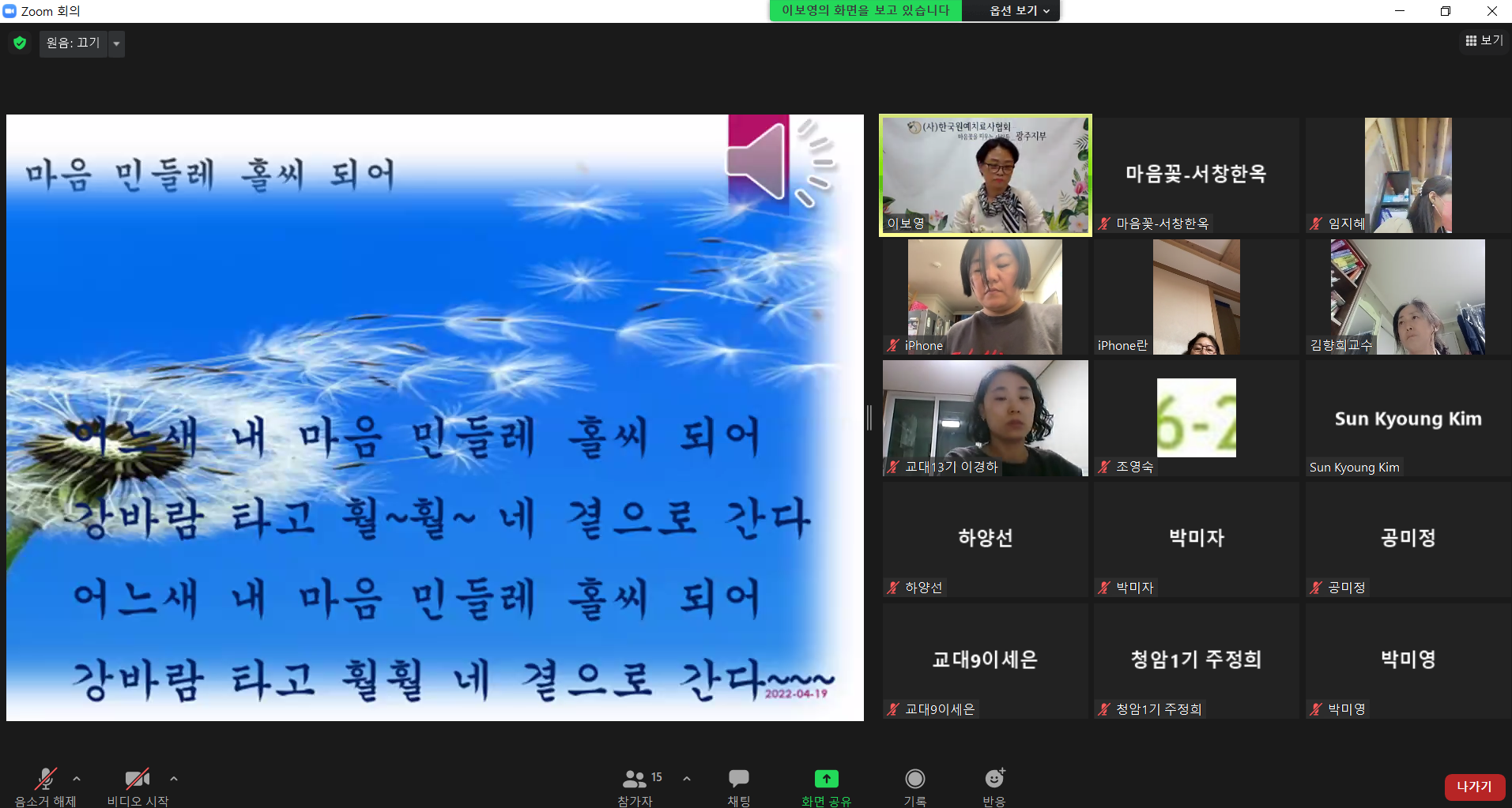 사회적거리두기도 해제 되었지만 전파력이 강한 변종바이러스로 인해 아직은 살짝 조심스러워 비대면 줌 라이브로 실시 된 역량강화는 김갑순지부장님의 활기넘치는 인사말과 함께 박정아강사님의 강의로 이어졌습니다.