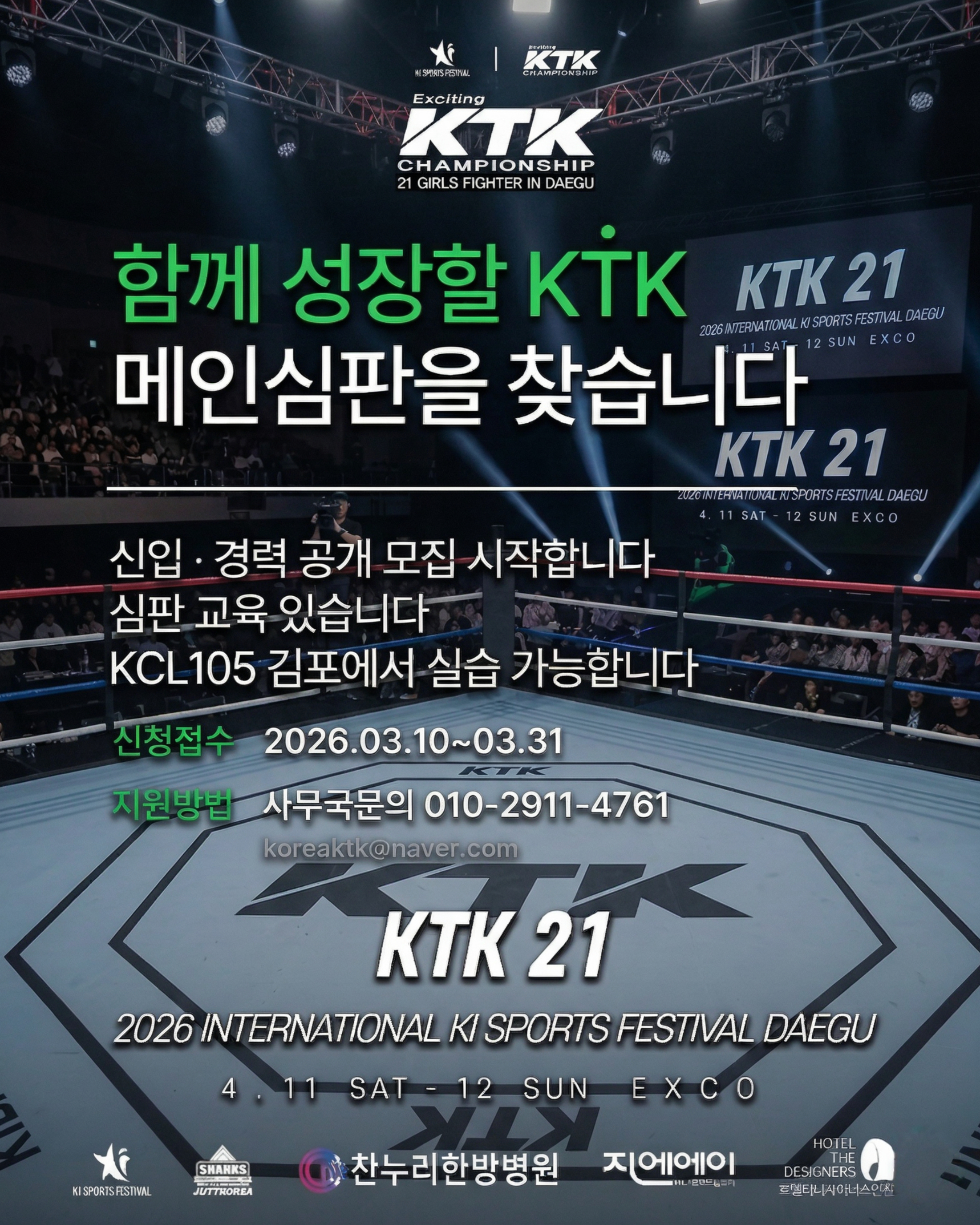 함께 성장할 KTK 메인심판을 모집합니다. 작성자대격협|작성시간26.03.09|조회수86 목록 댓글 0 글자크기 작게가 글자크기 크게가 경기의 흐름을 제어하고 선수의 안전을 최우선시하며 공정한 결과를 위해 책임질 수 있는 KTK 메인심판을 공개 모집 합니다. 문의 : 사무국01029114761 #KTK #입식타격명가 다음검색 현재 게시글 추가 기능 열기 북마크 공유하기 신고 센터로 신고 댓글 댓글 0 댓글쓰기 답글쓰기 댓글 리스트