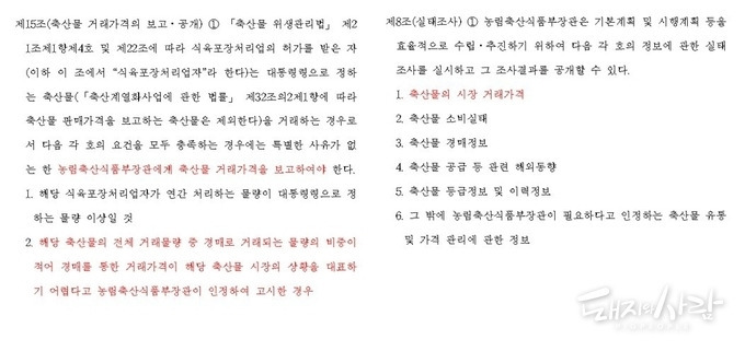 그러나 여당 문대림 의원이 새롭게 발의한 ‘축산물의 유통 및 가격 관리에 관한 법률안(관련 기사)’의 구조를 뜯어보면, 이러한 절충이 실제 방어장치로서 의미를 갖는지에 대해서는 의문이 제기됩니다. 문 의원안은 생산자·유통업자 간 실거래 가격을 법률상 상시 실태조사 대상에 명시하고, 농식품부 장관이 그 결과를 영업비밀 범위를 전제로 공개할 수 있도록 규정하고 있습니다(제8조).
