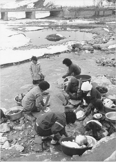▲ 잠실의 어느 차가운 개울물에 빨래를 하고 있는 부녀자들1988.03. ...