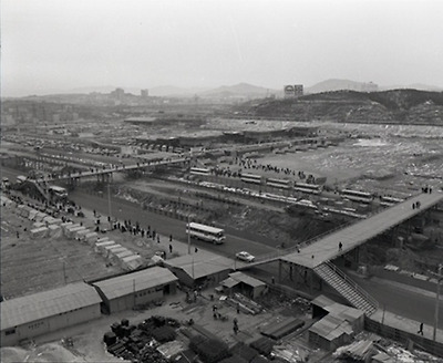 ▲ 본건물없이 승차장만으로 준공한 고속터미널. 1976년 ...