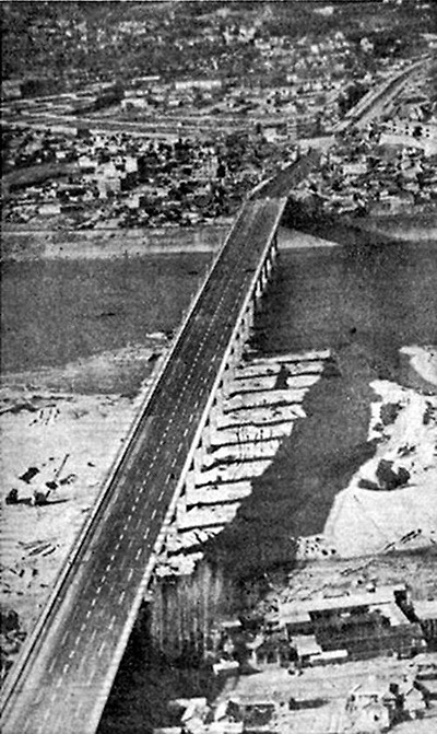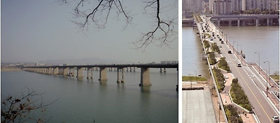 ▲ 예전의 광진교(광나루다리)와 현재의 광진교 옛 광진교는 일제때인 1936년에 준공한 왕복 2차선 다리인데 구조물 노후도가 심하여 철거되고 현재의 광진교는 97년 3월 그 자리에 교각을 다시 세우고 다리(폭 20m)에 자전거 전용 도로와 돌출 전망대가 있는 2003년 11월에 개통한 새 다리이지요...