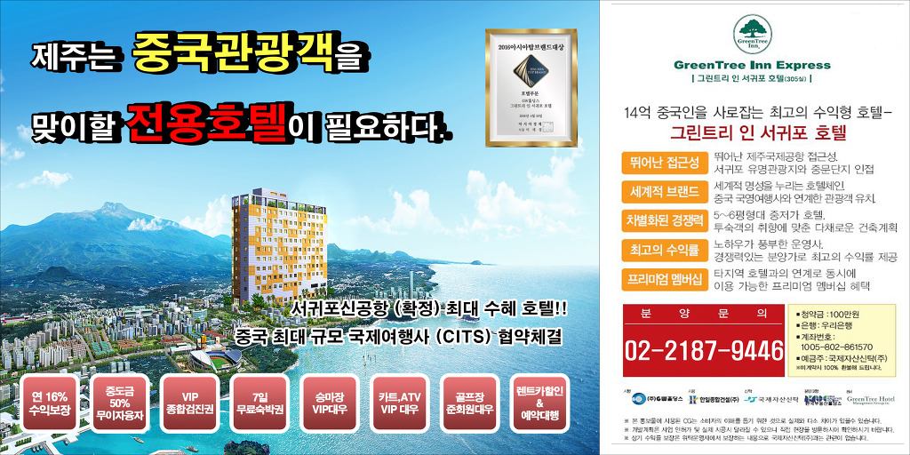 [부동산 소식] 그린트리 인 서귀포호텔(GreenTree Hotel) 분양 개시...제주도 서귀포에 들어서는 국내 첫 中관광객 전용 호텔