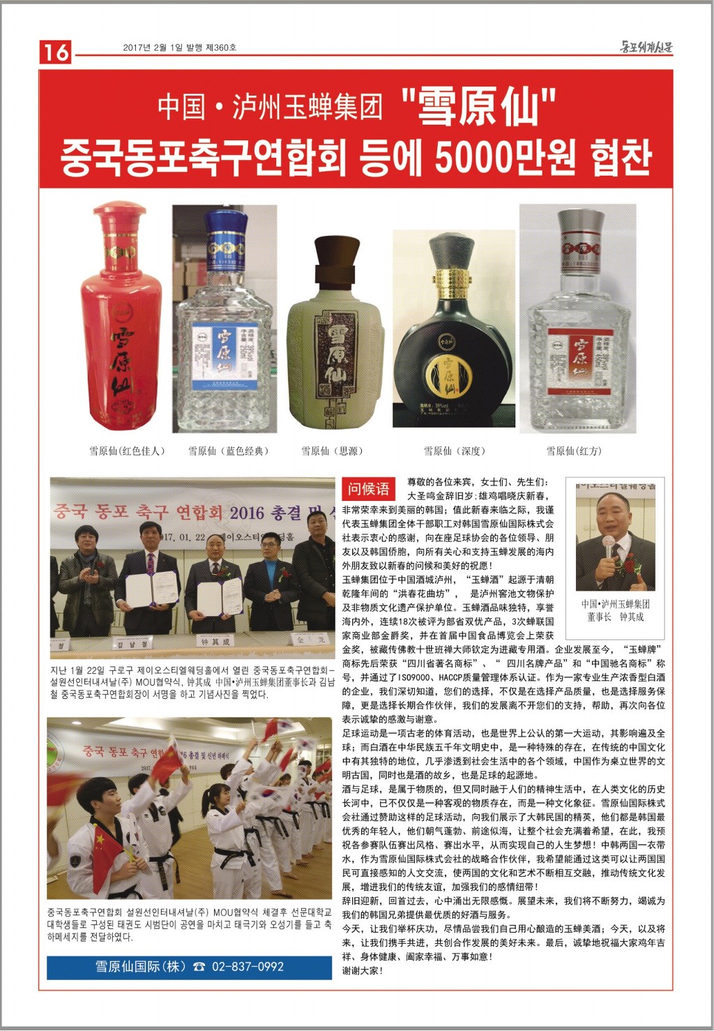 국내에는 15개팀으로 이루어진 중국동포축구연합회, 6개 팀으로 이루어진 제기차기연합회, 5개 팀으로 이루어진 배구연합회 모임 등이 있다. 축구연합회는 5천만원 중 3천만원을 협찬받아 올해는 풍족한 리그전을 치룰 것으로 기대된다. 김남철 중국동포축구연합회 회장은 “이는 중국동포 생활스포츠 발전에 대단한 일이다”며 “스포츠를 통해 중국동포가 더욱 합심 단결하여 한중교류에도 기여하는 건전한 공동체가 되겠다”고 포부를 밝혔다. 중국옥천그룹은 한국에 설원선인터내셔널(주) 독립법인을 설립하고 雪原仙의 국내 주류시장 진출을 꾀하고 있다.