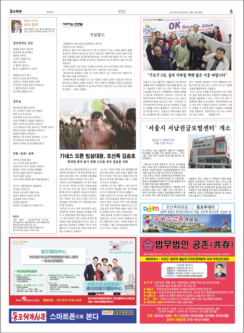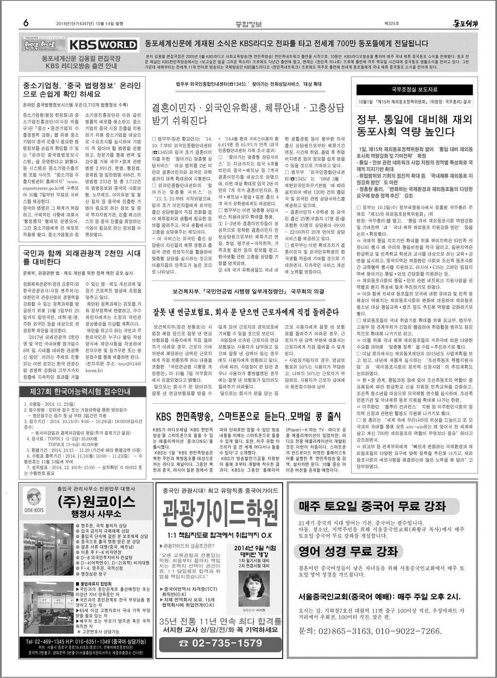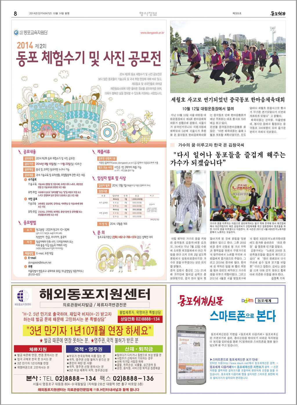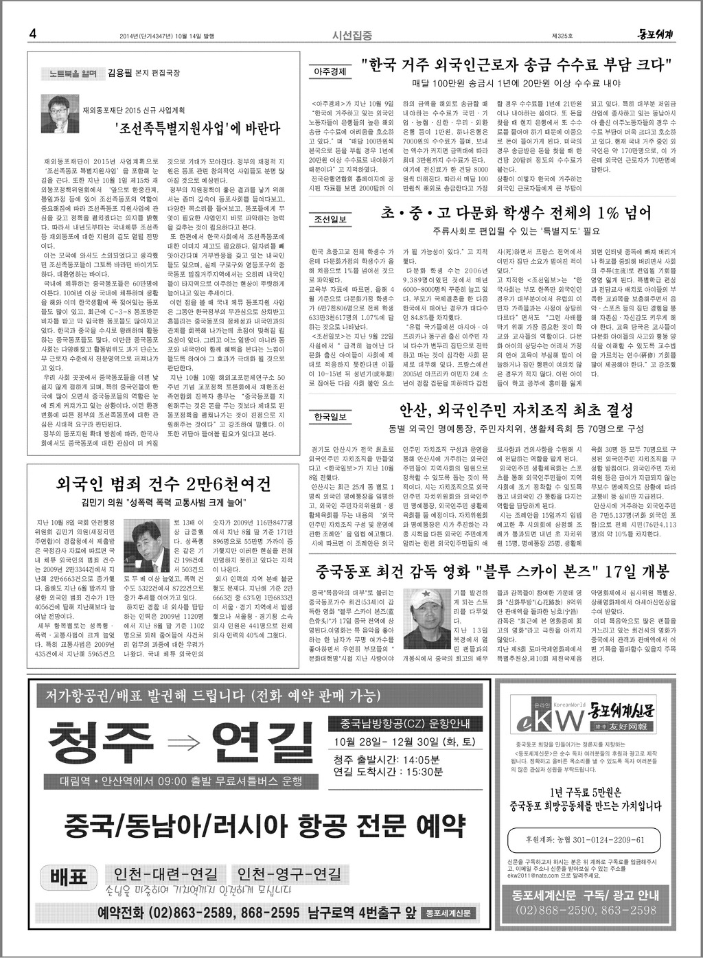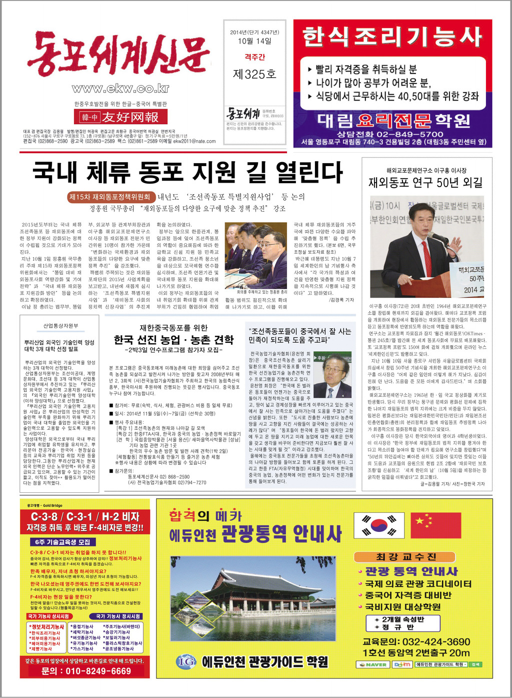 중국동포 희망 동포세계신문 제325호(2014.10.14일) 발행판입니다.