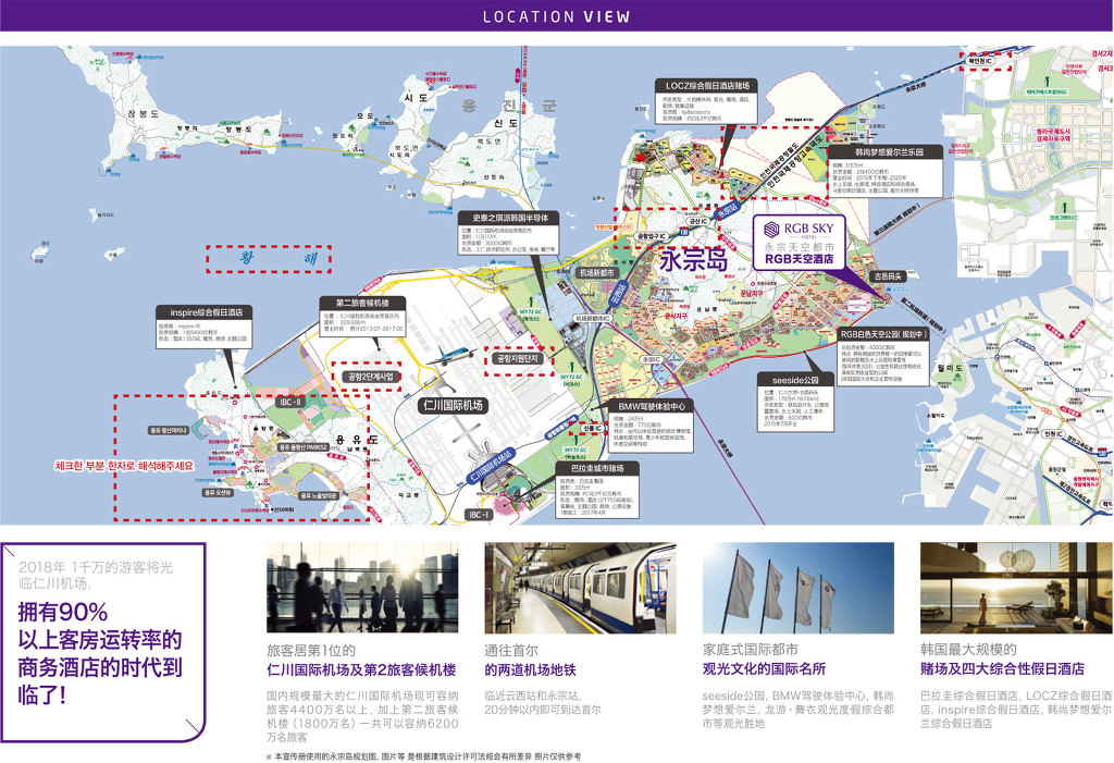인천 월미도를 연결하는 제2공항철도가 닿는 RGB스카이호텔은 3면이 바다 조망권을 갖고 있고 대지면적 2,840㎡ 전체면적 2만1,314㎡에 지하 2층~지상 17층 6개 타입(전용 23㎡~43㎡) 총 457개 객실로 구성되었다. 중국관광객의 한국문화체험을 위해 14개의 한실특화객실과 8개의 스위트룸을 갖춰 새로운 한국문화를 제공하면서 가족 단위 숙박고객까지 폭넓은 고객층을 수용할 수 있도록 섬세하게 설계되었다. 또 호텔 2층에는 사후면세점 등 편의시설이 들어서게 된다.