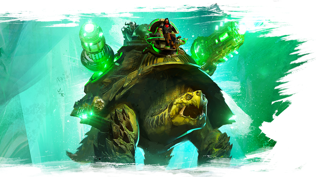 공성 거북이Luxon Armada의 후손들은 이 거대한 거북이들을 200년 넘게 키우고 훈련시켰습니다. 각 탈것에는 두 명의 라이더가 탈 수 있습니다. 한 명은 거북이를 조종하고 다른 한 명은 등껍질에 묶인 무기를 작동합니다. 자신의 걷는 전쟁 기계를 키우고 전투 모험을 위해 친구를 데려가십시오!