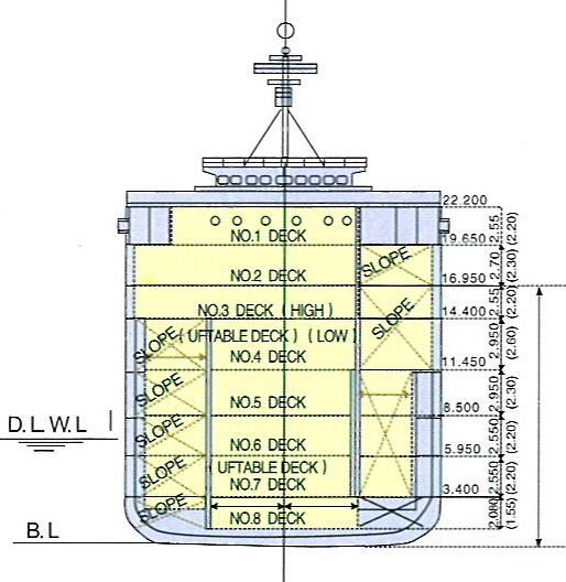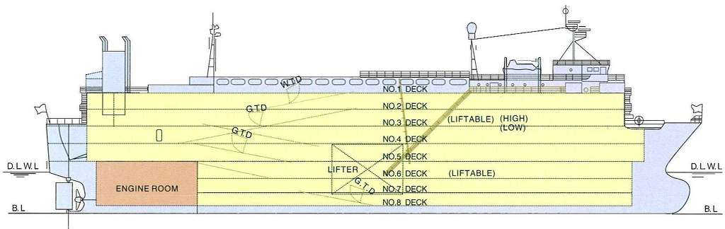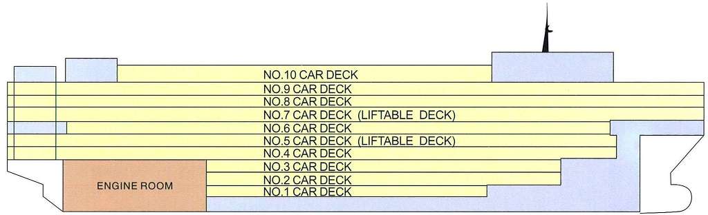 Pure Car Carrier의 가까운 친적뻘인 Pure car and Truck Carrier는 더 높고 더 무거운 화물을 싣을때 높이의 여유를 위해 승강이 가능한 데크를 가지는데 이건 총 수용량을 감소시키죠.