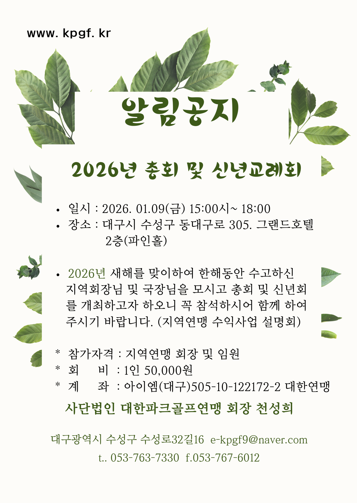 2026년 지역연맹 임원 신년교례회 작성자kpgf|작성시간25.12.26|조회수60 목록 댓글 1 글자크기 작게가 글자크기 크게가 다음검색 현재 게시글 추가 기능 열기 북마크 공유하기 신고 센터로 신고 댓글 댓글 1 댓글쓰기 답글쓰기 댓글 리스트 작성자인해 | 작성시간 26.01.05 수고많으십니다.성대한 신년 인사회가 되시기를빕니다.~^♡^ 댓글 전체보기