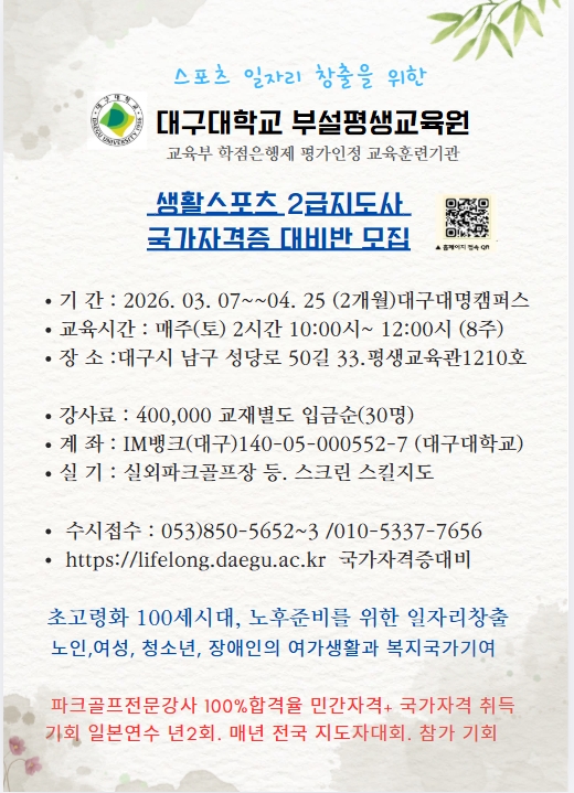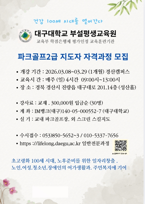 파크골프2급지도자교육 모집 작성자kpgf|작성시간26.02.10|조회수105 목록 댓글 0 글자크기 작게가 글자크기 크게가 다음검색 현재 게시글 추가 기능 열기 북마크 공유하기 신고 센터로 신고 댓글 댓글 0 댓글쓰기 답글쓰기 댓글 리스트