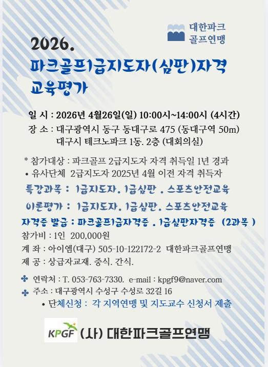 파크골프1급지도자(심판)교육평가 작성자kpgf|작성시간26.03.09|조회수59 목록 댓글 0 글자크기 작게가 글자크기 크게가 다음검색 현재 게시글 추가 기능 열기 북마크 공유하기 신고 센터로 신고 댓글 댓글 0 댓글쓰기 답글쓰기 댓글 리스트