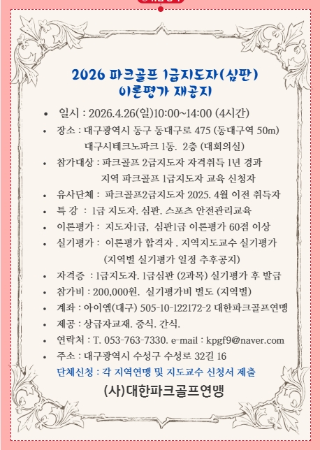 2026 파크골프1급지도자평가시험 작성자kpgf|작성시간26.03.27|조회수25 목록 댓글 0 글자크기 작게가 글자크기 크게가 다음검색 현재 게시글 추가 기능 열기 북마크 공유하기 신고 센터로 신고 댓글 댓글 0 댓글쓰기 답글쓰기 댓글 리스트
