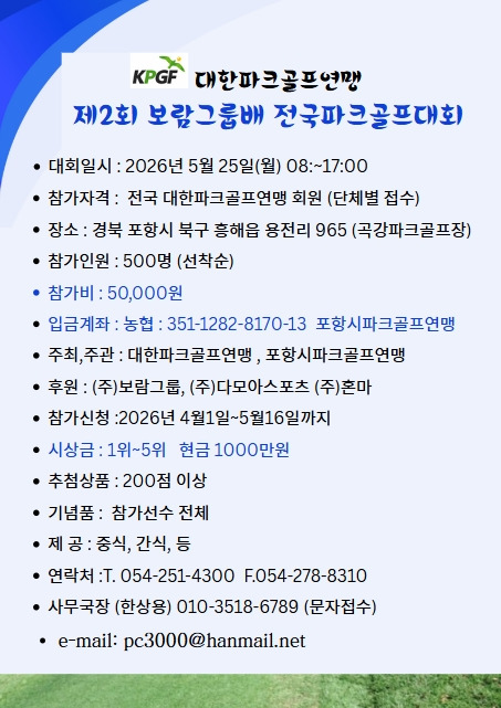제2회 보람그룹배 전국파크골프대회 작성자kpgf|작성시간26.04.01|조회수15 목록 댓글 0 글자크기 작게가 글자크기 크게가 다음검색 현재 게시글 추가 기능 열기 북마크 공유하기 신고 센터로 신고 댓글 댓글 0 댓글쓰기 답글쓰기 댓글 리스트